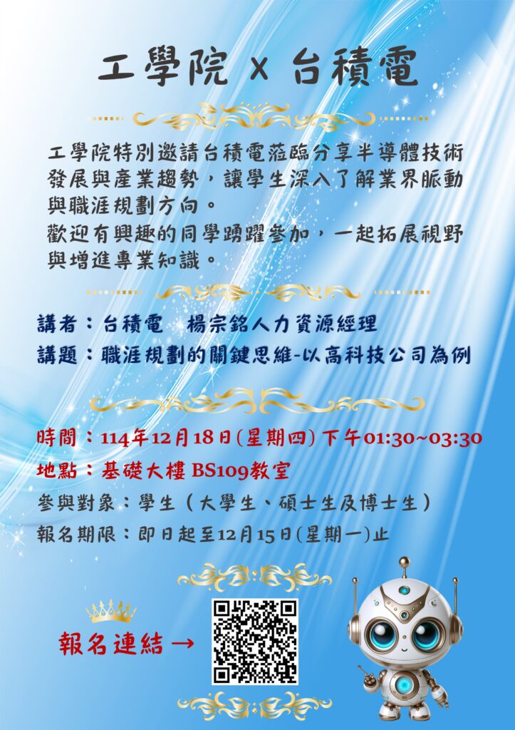 工學院特別邀請台積電蒞臨分享半導體技術發展與產業趨勢,讓學生深入了解業界脈動與職涯規劃方向。敬請轉知所屬學生踴躍參加,相關資訊如下,謝謝您。