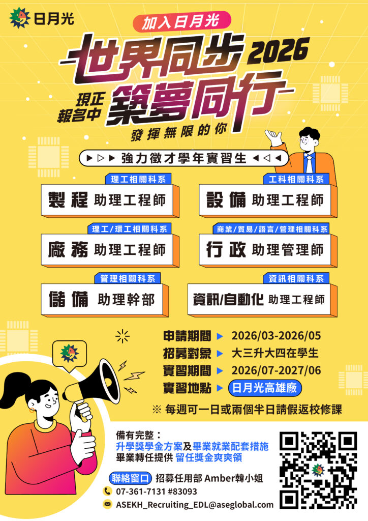 日月光半導體(ASE)高雄廠推出 「2026 大四學年實習計畫」。本計畫專為即將升大四的同學設計,不僅提供完整的職場對接機制,更貼心保有彈性的修課空間。
